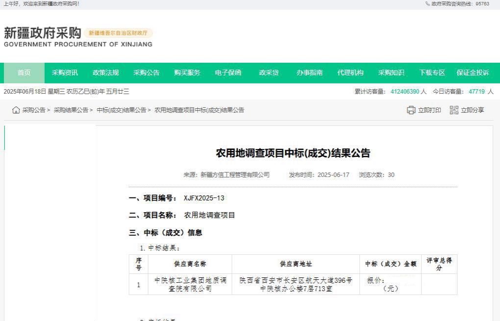 近日,布尔津县农用地调查入库项目招标结果正式公布,中陕核工业集团地质调查院有限公司凭借专业技术实力、科学合理的报价以及完善的实施方案脱颖而出,成功中标。此次成功中标,标志着地调院将为布尔津县农用地管理提供全方位、高质量的服务。
