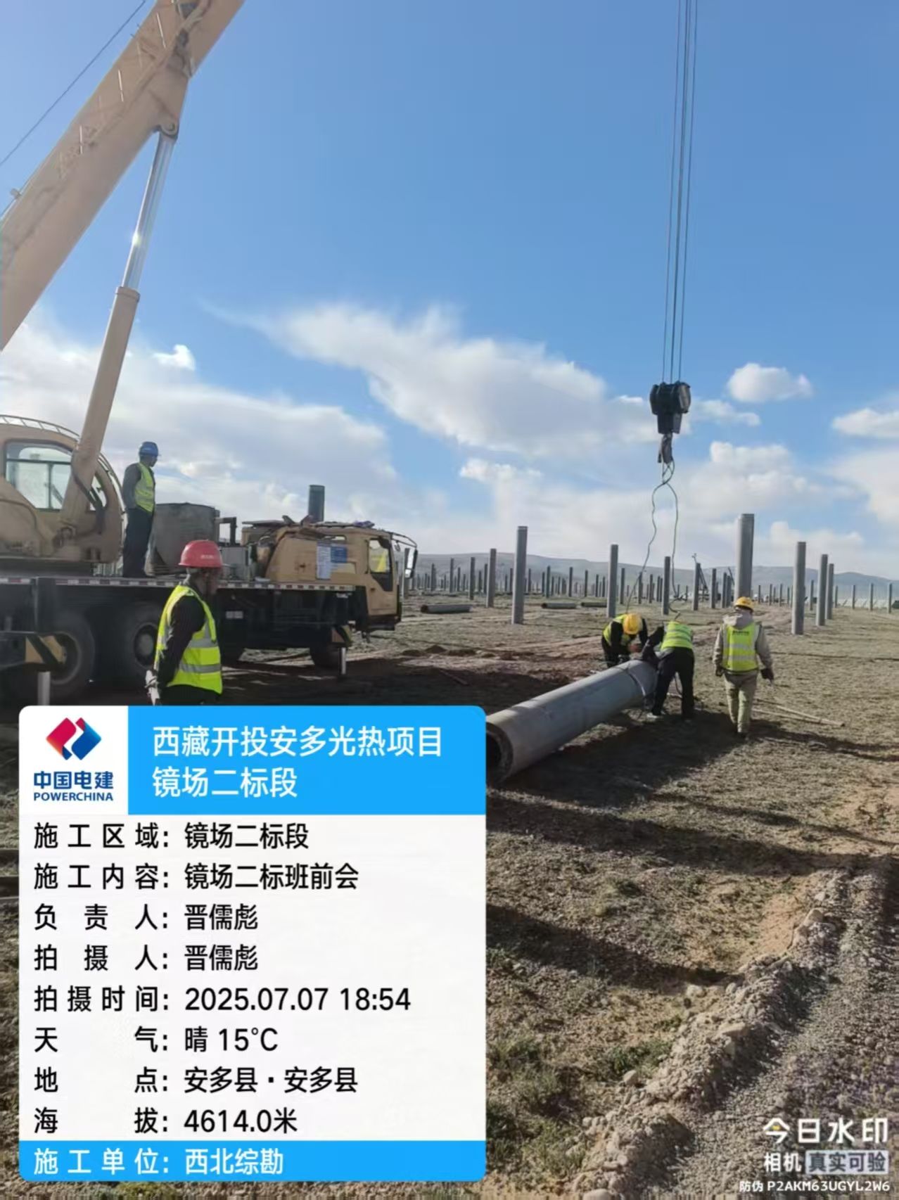 西藏开投安多县土硕100MW光热+800MW光伏一体化项目光热部分EPC总承包项目定日镜场建安工程II标项目由西北综勘新能源工程设计院承建,项目位于西藏那曲市安多县帕那镇东部约17.5km处,光热部分装机容量100兆瓦,场址海拔在4645米至4657米之间,是全球首个在4650米超高海拔、超低温度、极弱电网环境“三重挑战”下建设的光热电站。光热发电采用熔盐塔式技术路线,镜场总采光面积不小于80万平方米,储热时长不小于8h(以汽轮机额定效率折算等效储热8h),储热介质与传热介质均选用二元熔盐。项目采用先进的熔盐塔式光热技术,装机容量为100兆瓦,配置8小时的储热系统,通过1.6万面、80万平方米的定日镜将太阳光反射至吸热塔,使熔盐升温至560℃,再通过高温熔盐进行逆流换热,实现机械能向电能的转化,输出持续稳定的清洁能源。