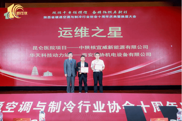 9月25日下午,由陕西省暖通空调与制冷行业协会主办、中陕核宜威新能源有限公司协办的“陕西省暖通空调与制冷行业协会十周年庆典暨换届大会”在西安召开。宜威公司昆仑医院项目荣获“运维之星”奖项、副总经理李胆荣获“贡献奖”。