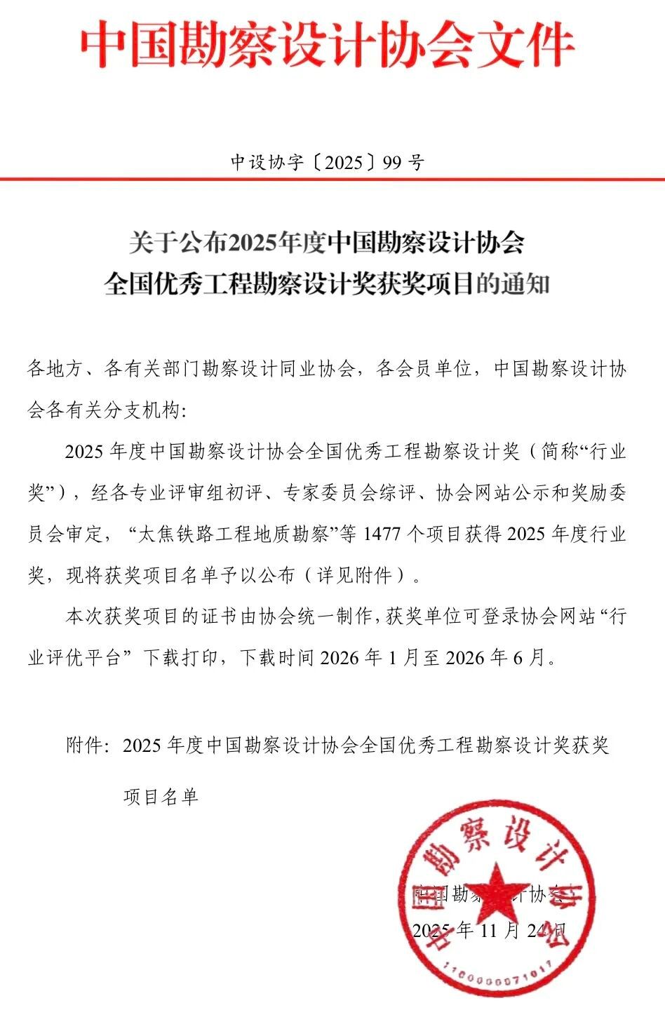 11月28日,勘察设计行业高质量发展大会暨中国勘察设计协会成立40周年庆祝活动在北京举行,大会发布《关于公布2025年度中国勘察设计协会全国优秀工程勘察设计奖获奖项目的通知》(中设协字〔2025〕99号),公布2025年度全国优秀工程勘察设计奖评选结果并举行颁奖典礼。中国勘察设计协会副理事长,中陕核集团总工程师,西北综勘党委书记、董事长燕建龙受邀参加大会。