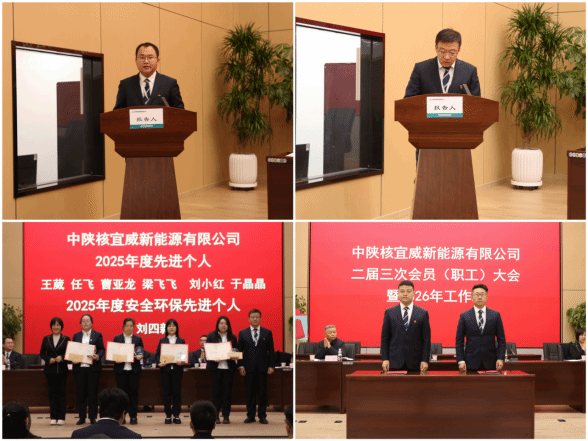 1月30日,中陕核宜威新能源有限公司召开二届三次会员(职工)大会暨2026年工作会。中陕核集团党委委员、纪委书记、监察专员蒙晓记,纪委工作部副部长、巡察办主任崔秦蜀到会指导。宜威公司党支部书记、董事长何厚锦,党支部委员、总经理陈晶及外部董事和其他领导班子成员、全体职工参加会议,党支部委员、副总经理、工会主席蔺啸宇主持会议。