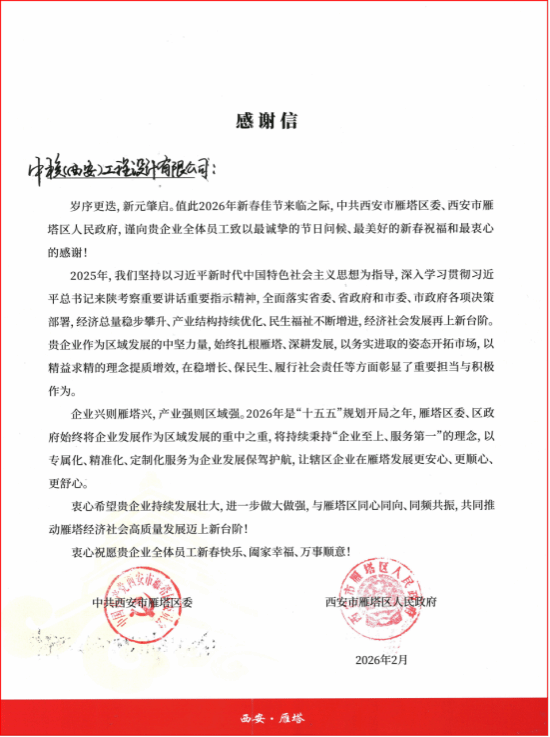 近日,中陕核西北建设计院喜获一封来自西安市雁塔区科技和工业信息化局的感谢信。信中,对西北建设计院2025年在雁塔区经济建设中的卓越贡献表示感谢,对西北建设计院与政府部门高效协作给予高度评价,并致以2026年新春的诚挚祝福,激励设计院持续发展壮大、进一步做大做强,在更高起点上实现新突破。
