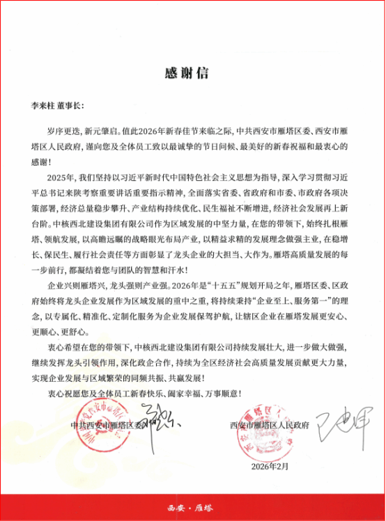 感谢信,不仅是对西北建实干成效的认可,更彰显了政企之间同心同向、互信互助的良好合作关系。西北建将以此为激励,持续践行国企担当,在服务区域发展中再立新功、再创佳绩。