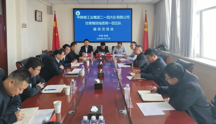 2026年2月27日,中陕核工业集团二一四大队有限公司党委书记、董事长付星一行,赴甘肃煤田地质局一四五队座谈交流。双方围绕深化新兴业务协同发展、拓展合作领域等方面进行了深入的交流。甘肃煤田地质局一四五队党委书记、队长刘世海参加座谈。
