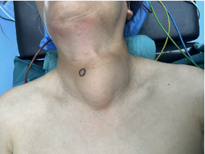 入院后的检查结果让医生皱起眉头,肿瘤直径达到7.4cm,充斥着整个脖前,并与颈部重要血管、神经紧密粘连,更棘手的是,部分瘤体已坠入胸骨后。在这种情况下手术,稍有不慎,就可能损伤喉返神经导致永久性声音嘶哑,或损伤甲状旁腺导致终身手足抽搐。