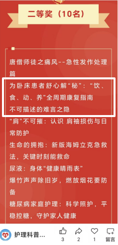 此次获奖的科普文章,正是源于临床一线护理人员对患者需求的敏锐观察与深入思考。朱东梅与鲜红梅针对老年患者长期卧床后易发便秘的问题,查阅文献、请教专家,融合快速康复理念,反复推敲表达方式,力求用最通俗的语言讲清楚最专业的知识。文章中配以“饮、食、动、养”全周期康复指南,辅以食物简图,让患者一目了然。这些创作背后,是一代代二一五医院护理人“把患者放在心上”的初心传承。