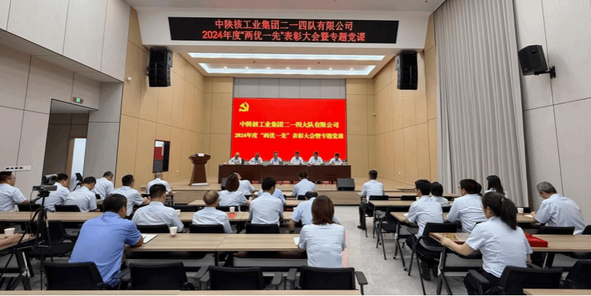 为庆祝中国共产党成立104周年,表彰先进典型,激励广大党员干部担当作为,扎实推进深入贯彻中央八项规定精神学习教育走深走实。2025年6月30日下午,中陕核二一四队在中陕核资源大厦4楼会议室召开2024年度“两优一先”表彰大会暨专题党课。二一四队党委书记、董事长付星讲话并作深入贯彻中央八项规定精神学习教育专题党课。会议由二一四队党委委员、总经理王朋主持。