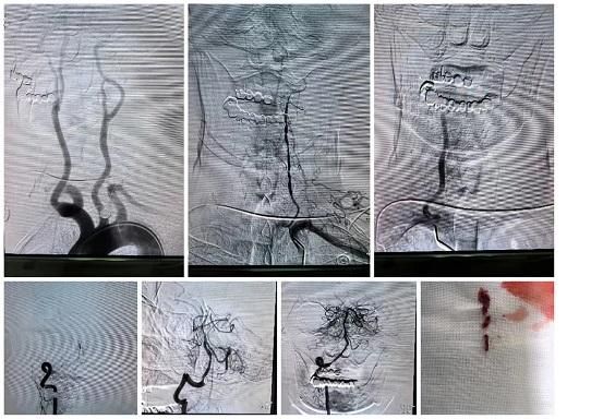入院时,刘大爷已呈嗜睡状,言语含糊,右侧肌力2级,急查颅脑DWI显示:脑干、双侧枕叶及双侧小脑半球多发弥散受限信号,右侧基底节区、侧脑室体旁DWI低信号。综合病情与检查结果,刘大爷被诊断为:基底脑动脉闭塞脑梗死急性期(TOAST型 大动脉粥样硬化)右侧大脑中动脉狭窄,右侧颈内动脉狭窄。在这危及生命的关键时刻,神经内二科付锋主任临危不乱,立即完善术前准备,并在立局麻下进行股骨动脉穿刺全脑血管造影术+颅内动脉去栓术,历时两小时,手术顺利完成。术后第二天,刘大爷神志清楚,言语清晰,右上肢肌力5级,右下肢肌力4级,手术效果非常显著。