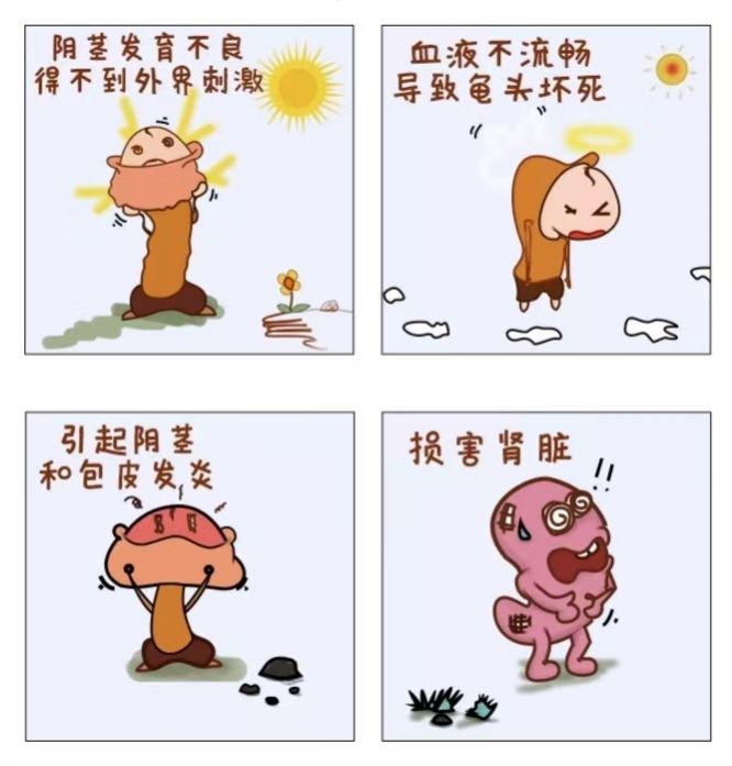 儿童包皮过长及包茎,容易导致包皮粘连,影响阴茎的发育;包皮覆盖龟头,在冠状沟处形成的相对封闭空间,容易藏污纳垢,诱发包皮龟头炎,包皮垢是导致男性阴茎癌、女性子宫颈癌的重要原因之一。