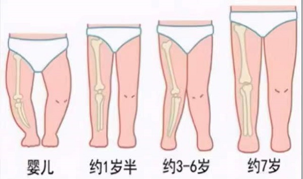 下肢由出生的“O型腿”逐渐变成“直腿”,进而在2岁后开始表现为 “X型腿”,且逐渐“加重”,往往在3~4岁时小儿“X型腿”最明显,此后膝外翻角度逐渐缩小,最终随着生长发育,多数小儿在6岁时即可达到正常5°-7°的膝外翻状态。有研究表明,通常女性比男性外翻要大一些。某些家长发现孩子腿不直,进而采用“绑腿”的方法矫正。这是不必要的,甚至是有害的,如婴儿期操作不当可能导致儿童髋关节发育不良(DDH)。