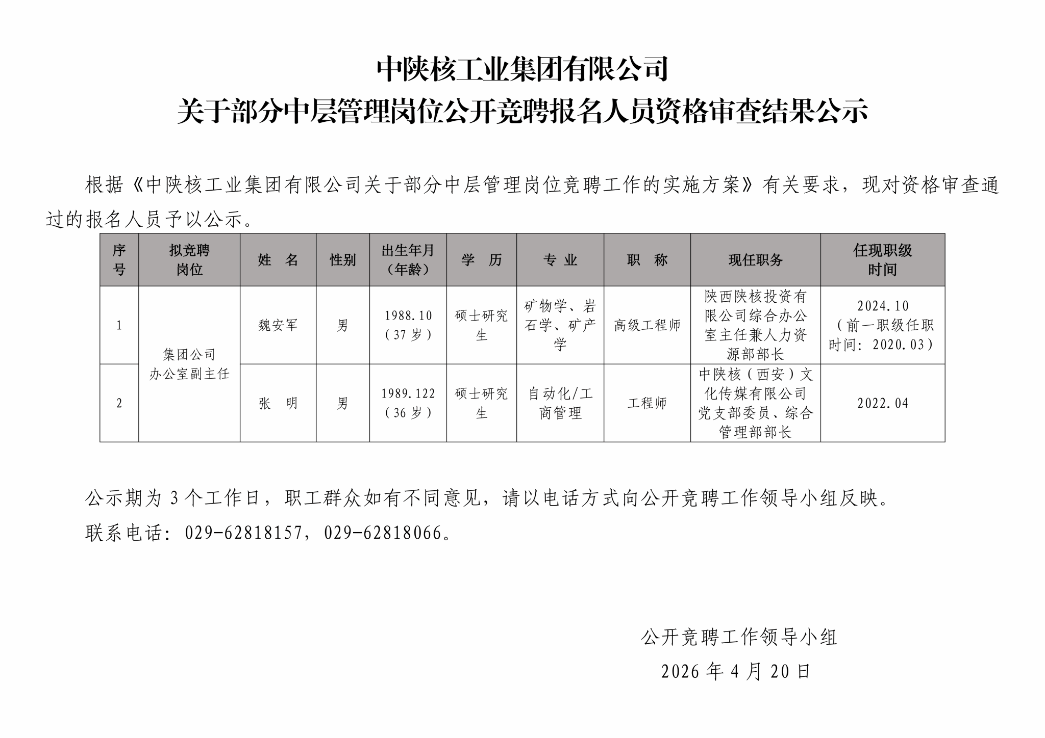 中陕核工业集团有限公司关于部分中层管理岗位公开竞聘报名人员资格审查结果公示