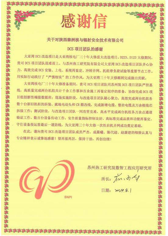 信任满载,实力赢赞!中陕核秦洲公司收到一封感谢信