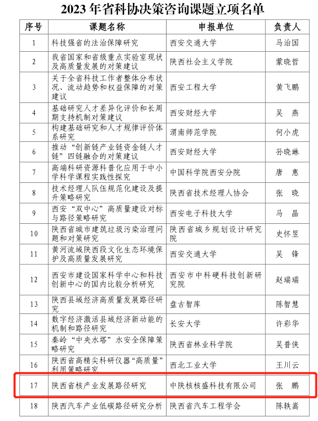 近日,陕西省科学技术协会公布了2023年度陕西省科协决策咨询课题立项结果(陕科协发〔2023〕宣字14号),核盛公司总经理张鹏博士获批省科协决策咨询课题1项,这是今年以来核盛公司第4个省级项目立项,公司的科研综合...