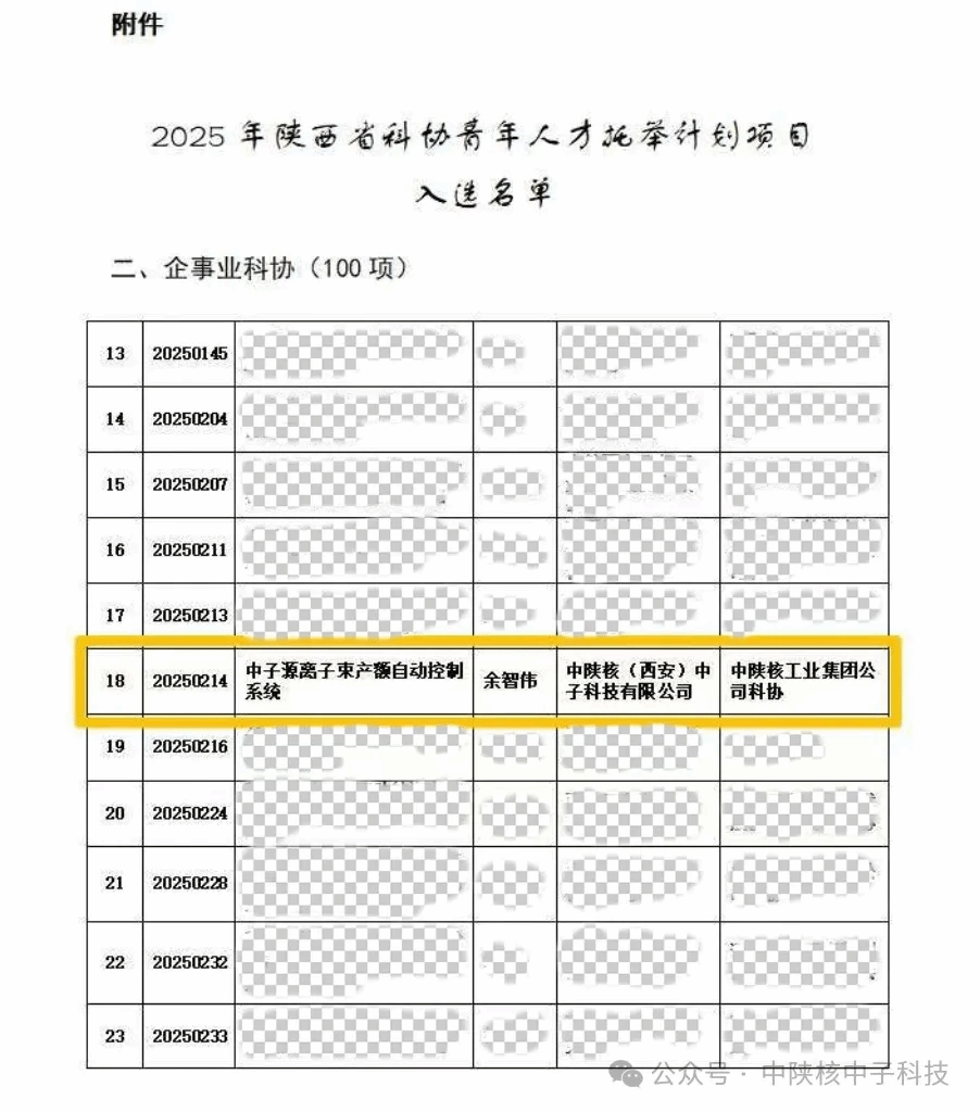 近日,陕西省科学技术协会公布了2025年陕西省科协青年人才托举计划项目评审结果,中陕核(西安)中子科技有限公司青年工程师余智伟负责的 “中子源离子束产额自动控制系统” 项目成功入围。陕西省科协青年人才托举计划项目是陕西省科学技术协会为鼓励我省青年科技人才矢志科技自立自强,主动服务陕西创新驱动高质量发展大局,强化对青年人才苗子的发现举荐作用,扶持年轻人才逐步成长为德才兼备、勇于创新的优秀科技人才实施的人才支持计划。...