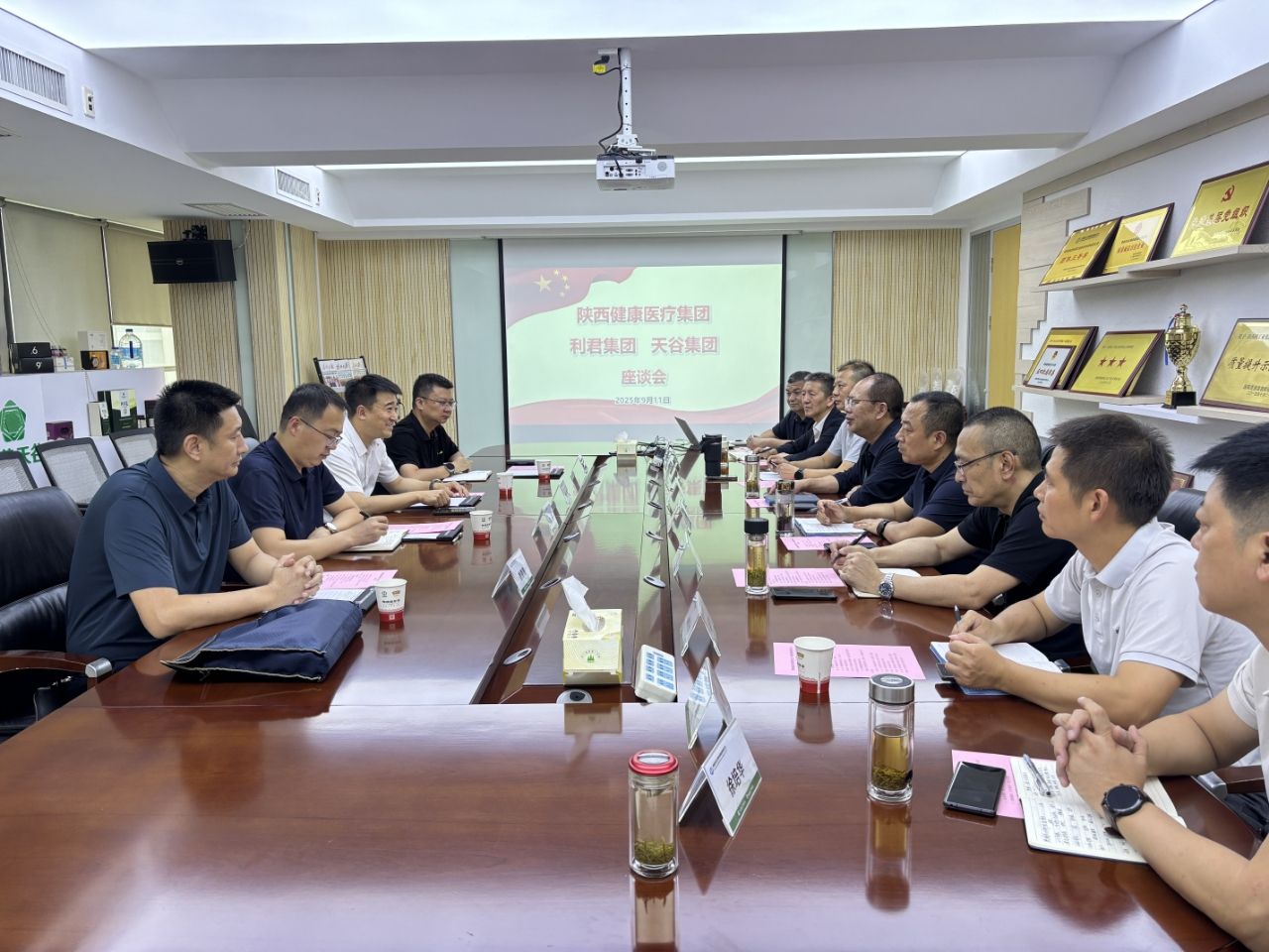 9月11日,中陕核天谷集团、中陕核利君集团与陕西健康党委书记、董事长张林一行座谈交流,利君集团党委书记、董事长、天谷集团党委书记、执行董事李雪松主持座谈会。李雪松对张林一行表示欢迎,对陕西健康与天谷集团、利君集团长期以来的业务支持和帮助表示感谢。本着兄弟单位相互交流、合作共赢的理念,双方就当前中医药行业发展趋势、深化产业合作、促进资源共享与优势互补进行了深入探讨。张林详细介绍了陕西健康的发展历程、主营业务以及公司架构等基本情况。...