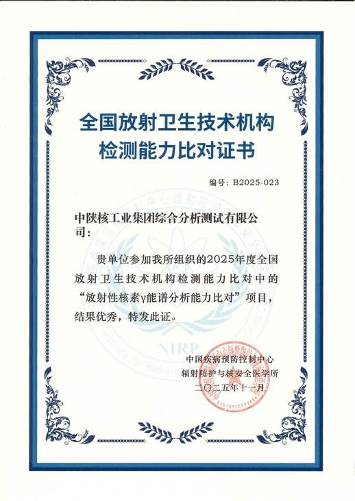 近日,中国疾病预防控制中心辐射防护与核安全医学所召开2025年度全国放射卫生技术机构检测能力比对总结会,正式公布考核结果。在全国64家参与放射性核素γ能谱分析能力比对的机构中,中陕核测试公司凭借精准的检测技术、严谨的分析流程及可靠的结果数据,成功跻身19家优秀机构行列,成为陕西省内唯一获此殊荣的单位,充分彰显了公司在放射卫生安全监测领域的过硬实力。自2024年底成功取得放射卫生技术服务机构甲级资质以来,测试公司深耕放射卫生技术服务领域,...