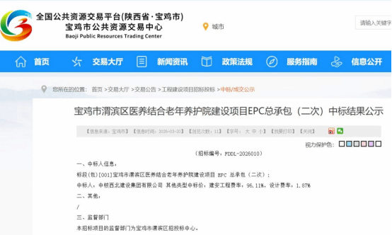 近日,中核西北集团以****万元成功中标宝鸡渭滨医养结合养护院EPC总承包项目,将全面负责本项目设计、采购、施工一体化全流程建设任务,以优质品质打造区域医养融合标杆工程。 宝鸡渭滨医养结合养护院EPC总承包项目由宝鸡市渭滨区宝桥医院投资建设,采用新建与改建相结合模式实施,总建筑面积18756.平方米,占地约28.13亩,建成后可提供400张医养结合服务床位,将有效填补渭滨区高端医养结合养老服供给空白,为老年群体提供集医疗、...