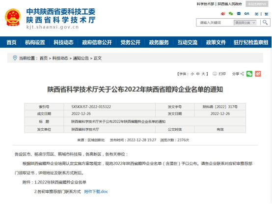 日前,陕西省科学技术厅公布了《陕西省科学技术厅关于公布2022年陕西省瞪羚企业名单的通知》(陕科函〔2022〕317号),根据陕西省瞪羚企业培育认定实施方案等规定,经属地推荐、第三方机构合规性审查、专家评审、网上...