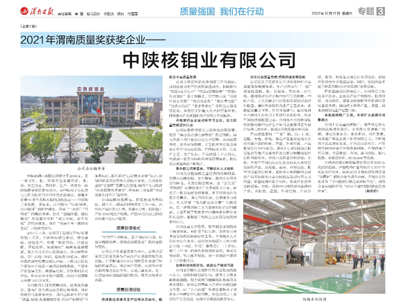 近日,通过《渭南市人民政府办公室关于2021年渭南质量奖渭南质量奖提名奖及标准化工作先进的通报》(渭政办发[2022]71号)文件获知,中陕核钼业有限公司成功荣获“2021年渭南质量奖”。12月17日,《渭南日报》刊载了...