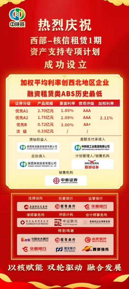 近日,由陕核投资所属子公司陕核租赁作为原始权益人的“西部-核信租赁1期资产支持专项计划”成功发行,总规模达5.5亿元,加权平均票面利率为2.11%。此次发行是陕核租赁继2024年首次亮相资本市场后的又一融资举措,加权平均票面利率创下西北地区融资租赁ABS历史新低。自2018年成立以来,陕核租赁在中陕核集团和陕核投资的正确领导下,始终秉持产融结合的初心使命,坚持市场化运作与集团内部协同发展并重,紧扣租赁业务本源,积极拓展资本市场融资渠道,...