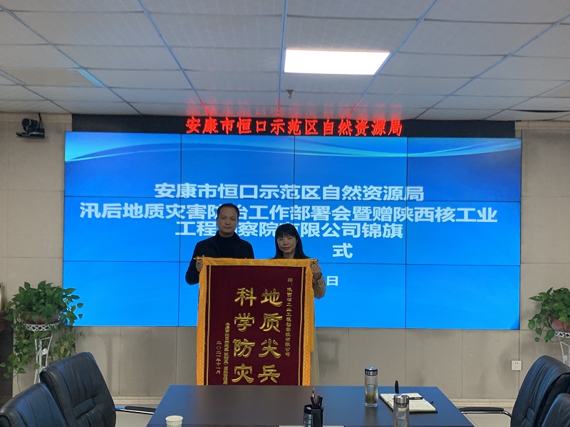 2021年11月1日,安康市恒口示范区自然资源局召开“汛后地质灾害防治工作部署会,中陕核工勘院荣获“地质尖兵 科学防灾”锦旗。 授旗仪式上,恒口示范区自然资源局副局长陈红会对中陕核工勘院汛期的地质灾害防治工作...