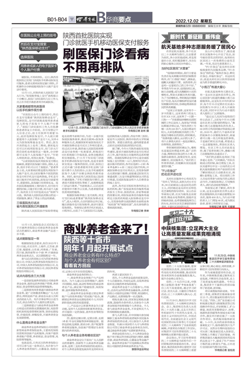 12月2日,《华商报》在“学习二十大 我们在行动”主题专栏刊发《中陕核集团:立足两大主业 让高质量发展成果竞相涌现》文章,集中展现了中陕核集团紧紧围绕学习贯彻党的二十大精神,持续聚焦双主业发展和深化企业改革...