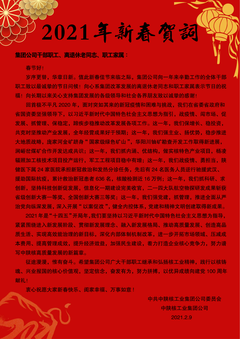 律回春渐,万象更新。2月18日,农历正月初七,春节后上班的第一天,集团公司党委书记、董事长杨百锁带领集团班子成员给总部机关及航天基地部分单位干部职工拜年,并送上新春的祝福。 “新年好”“春节快乐”……,伴...