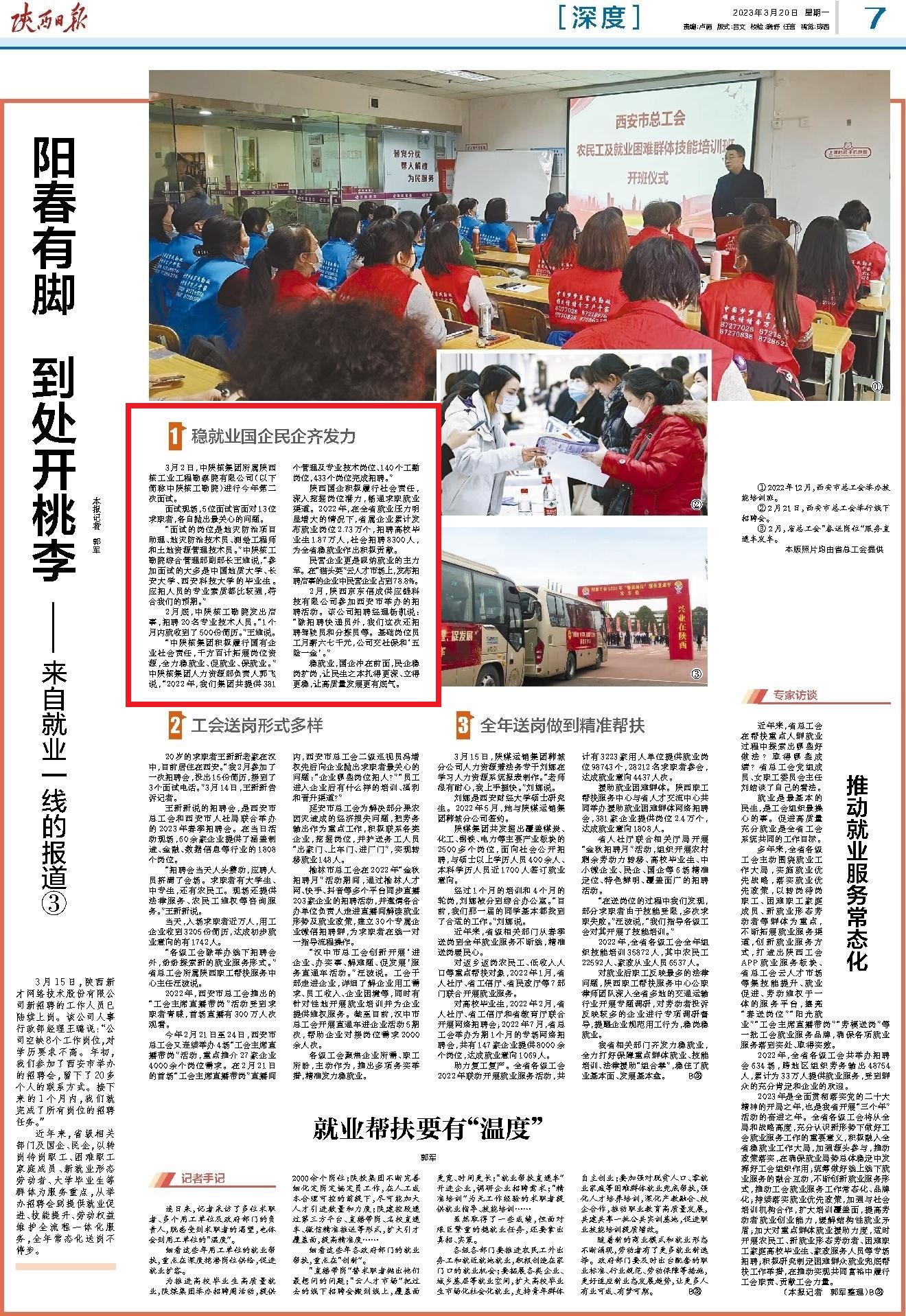 3月20日,《陕西日报》刊发文章《阳春有脚 到处开桃李——来自就业一线的报道③》,重点报道了中陕核集团积极履行国有企业社会责任,千方百计拓展岗位资源,全力稳就业、稳增长、促发展,为全省经济社会发展作出了积...