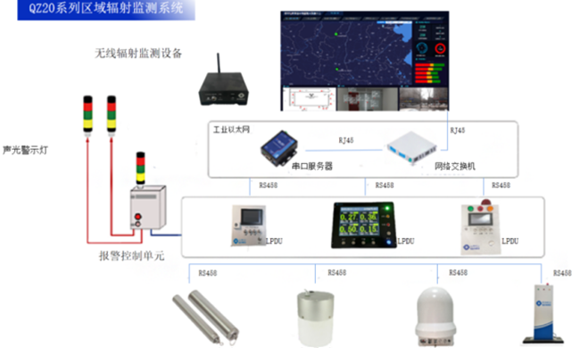 QZ20系列区域辐射监测系统是一款可灵活搭配一种或多种探测器、适用于各类辐射工作场所辐射环境测量的多功能产品。通过主机搭载多种智能化探头,实现X、γ以及中子射线的在线实时监测和数据实时传输,在超过设定的阈值剂量时,通过声光报警方式提醒工作人员及时撤离。系统由一套系统软件、监测主机和多个探测器组成,主机与探测器之间采用RS485总线、TCP/IP网络协议进行通信连接,也可拓展采用无线网络通讯连接