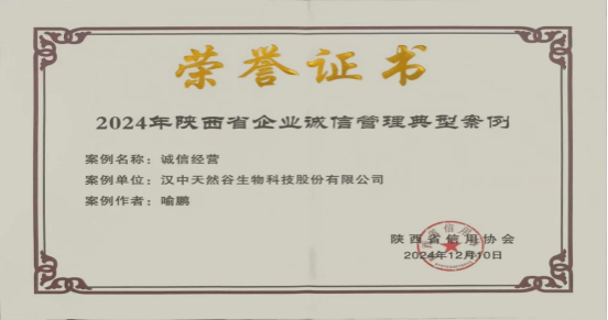会议发布了信用指数(TOP100)的上市公司,并邀请国内知名诚信企业代表进行了主题演讲和案例分享。在表彰环节中,天然谷公司申报的主题为《诚信经营》的案例被评定定为“2024年陕西省企业诚信管理典型案例”单位。