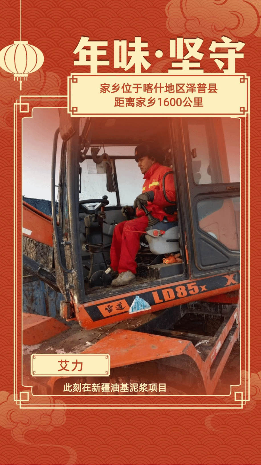 艾力,此刻在生态公司新疆油基泥浆项目,家乡位于喀什地区泽普县,距离家乡1600公里。今年春节我在岗,我的岗位是挖机驾驶员,负责倒料装车工作,保证在新疆油田钻井队的工作顺利运行。