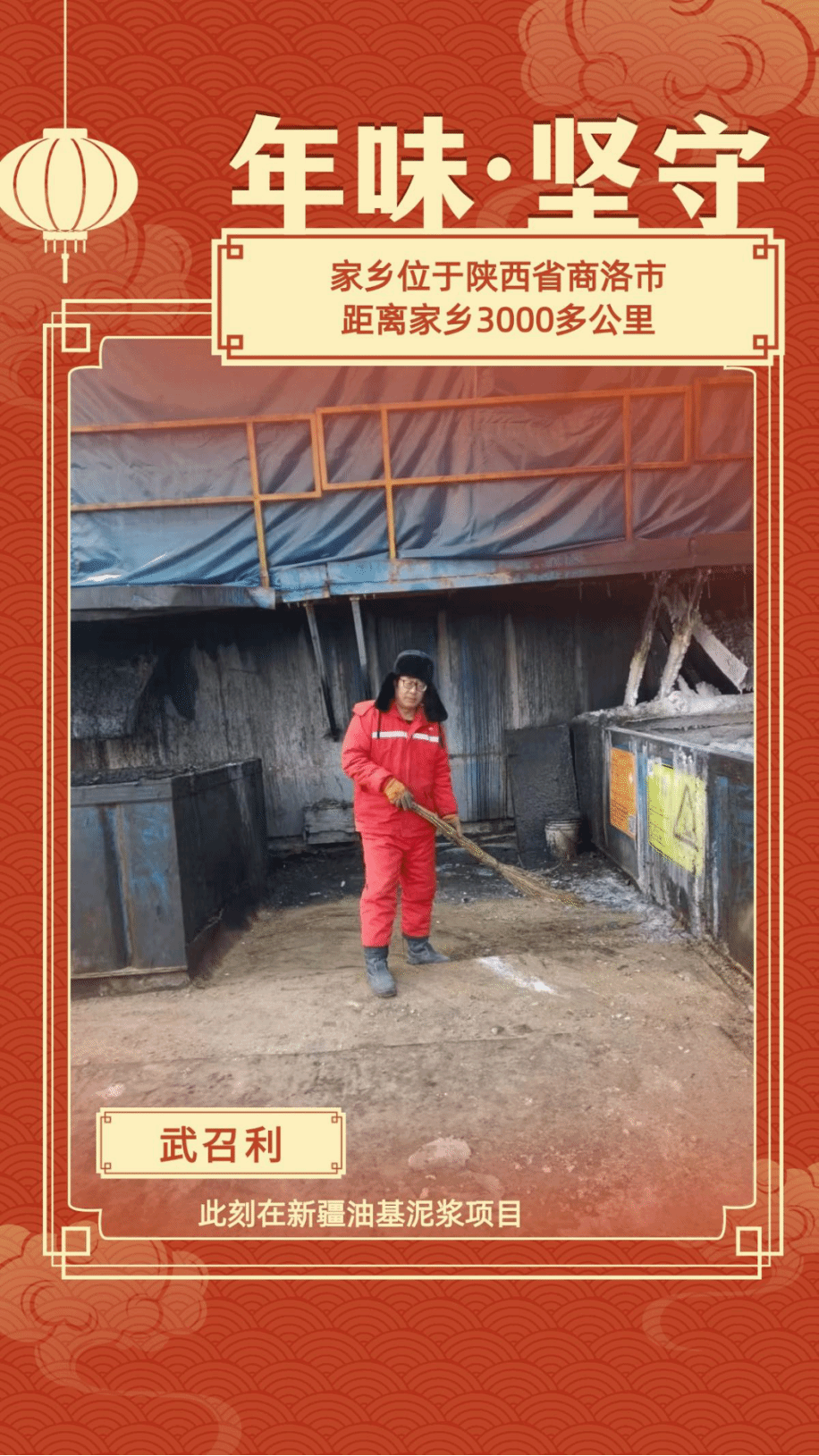 武召利,此刻在生态公司新疆油基泥浆项目,家乡位于陕西省商洛市,距离家乡3000多公里。今年春节我在岗,我的岗位是操作设备员,保证在新疆油田钻井队的工作顺利运行。