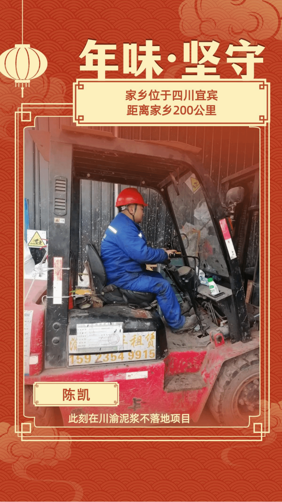 陈凯,此刻在生态公司川渝泥浆不落地项目,家乡位于四川宜宾,距离家乡200公里。今年春节我在岗,我的岗位是叉车操作工,负责操作叉车转运岩屑工作,保证井队生产顺利进行。