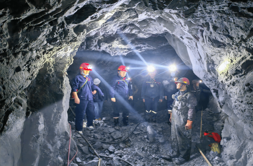 郭建军一行到达项目硐探施工现场后,全面检查了硐探工程现场实施情况,仔细听取了项目组安全员对项目进展和安全管理工作的详细汇报,随后深入坑道平巷内检查现场施工情况。