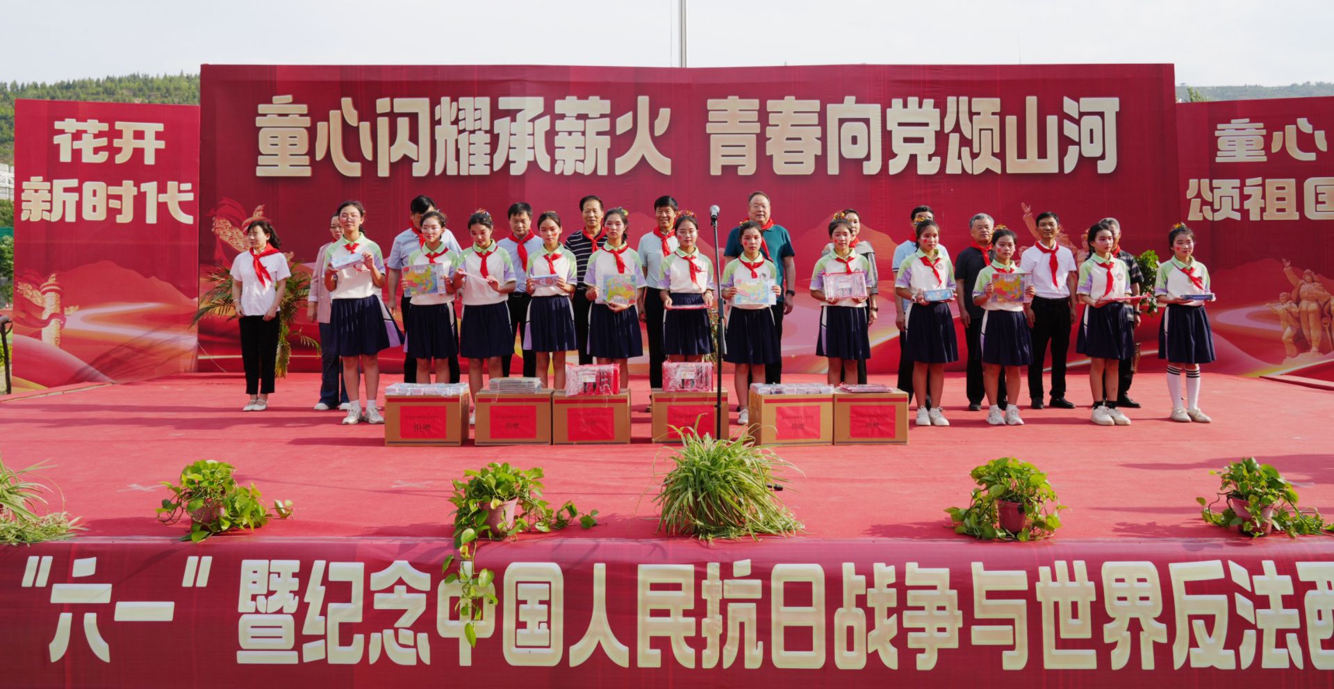 5月23日下午,为迎接即将到来的六一国际儿童节,“庆‘六一’暨纪念中国人民抗日战争与世界反法西斯战争胜利80周年” 文艺汇演在潼关县秦东镇滨河小学举行。陕西省慈善协会副会长张文亮,中陕核集团总工程师、院党委书记、院长燕建龙,渭南市慈善协会副会长胡寿文,潼关县副县长王江涛,潼关县慈善协会会长王乔,潼关县教体局党委书记、局长李军亮,副院长李运军、樊丽萍、席鹏等领导嘉宾齐聚现场,与滨河小学全体师生及家长共同度过一个难忘而有意义的节日。