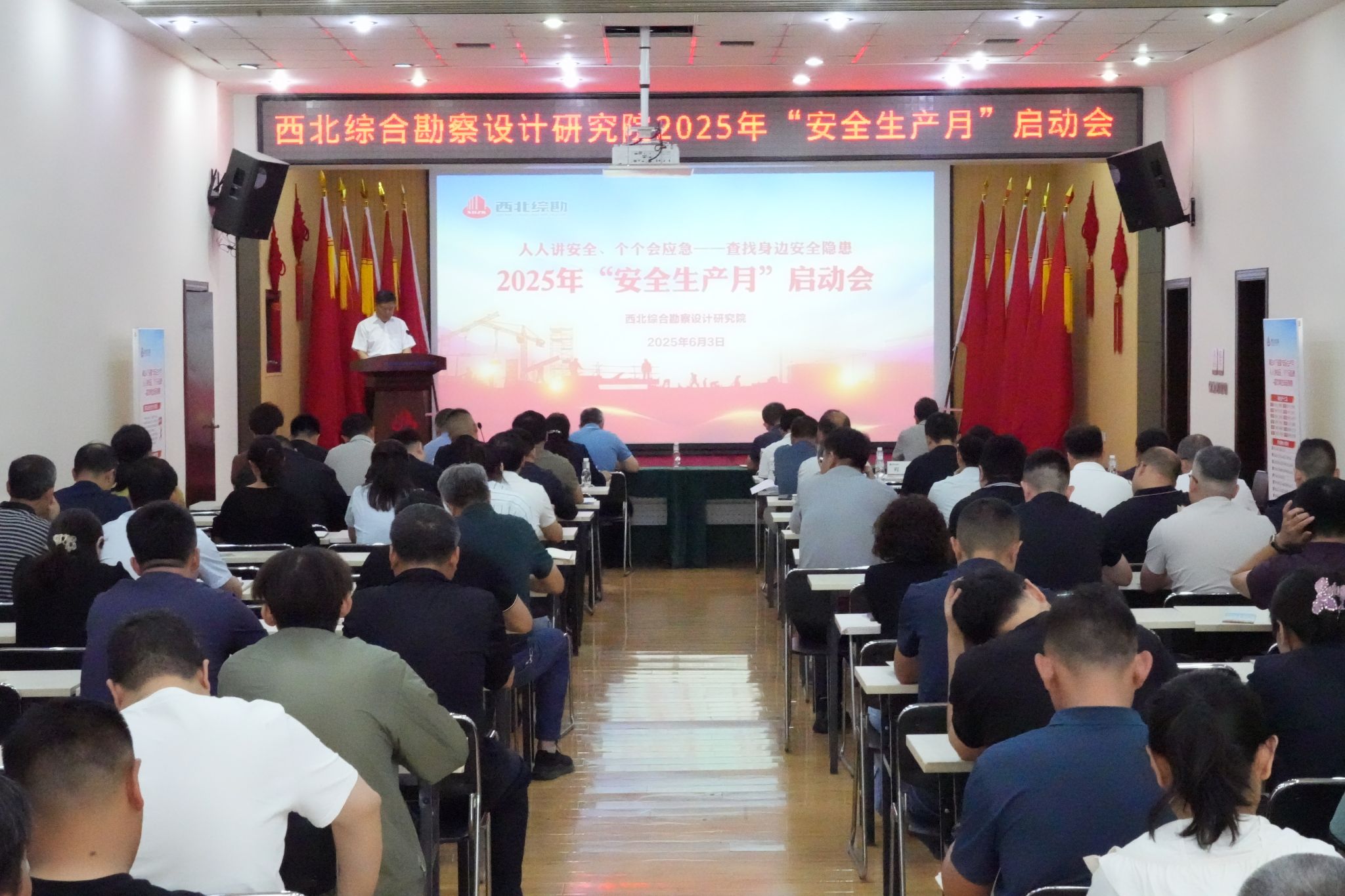 2025年6月是第24个全国“安全生产月”,活动主题是“人人讲安全 个个会应急——查找身边安全隐患”。为深入贯彻落实习近平总书记关于安全生产的重要论述和重要指示批示精神,根据中陕核集团《关于开展2025年“安全生产月”活动的通知》要求,扎实推进安全生产宣传教育工作,推动安全主体责任落实,提升全员安全意识与应急避险能力,筑牢我院安全生产防线,6月3日,院召开“安全生产月”活动启动会议。院领导班子、各部门负责人、各项目部经理、安全管理人员及职工代表近80人参加会议。