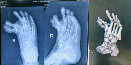 二一五医院足踝外科宋强主任团队接诊后,为李先生进行了系统评估。诊断结果远比单一的“多趾”复杂,右足先天性拇内翻、多趾畸形、并发的第2、3趾内翻,以及最关键的第一、二跖骨间存在“骨桥”。两根本该独立活动的脚部骨骼,被一根多长出来的骨头强行连接在一起,严重限制了骨骼的正常复位,是导致手术复杂的关键所在。