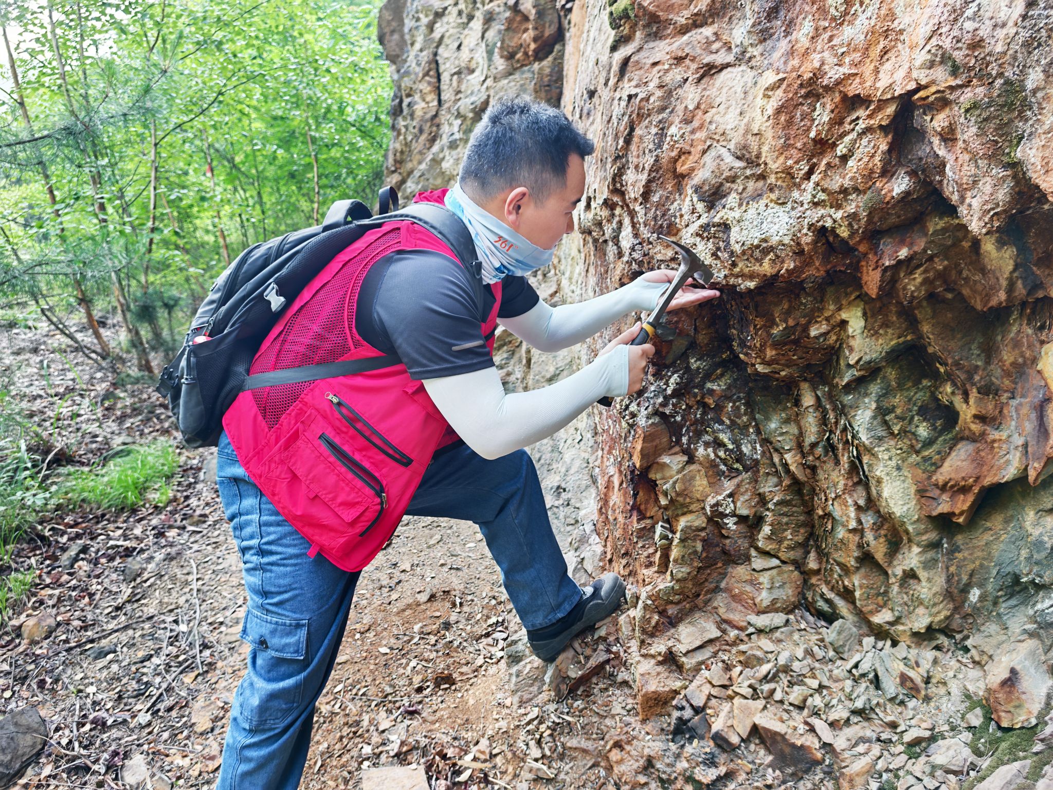 完成隧道任务后,王璐马不停蹄赶往山顶踏勘点。午后阳光洒在他红色工装上,他坐在基岩上休整时,仍以地质锤轻轻敲击岩面,通过回响岩石硬度与风化程度,目光紧盯可能藏着找矿线索的细微蚀变带。