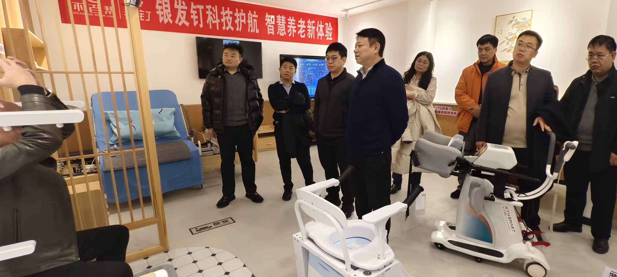 考察组先后走访兴平颐和康养中心、咸阳不老帮智慧康养中心等多个场所,在不老帮董事长王烨的全程陪同下,重点体验“智慧为老服务系统”,详细咨询“银发钉”平台运营流程、数据安全保障等关键问题,现场观摩智能护理床等设备功能演示,深入了解不老帮在机构养老、社区养老中的实践经验,以及适老化产品研发与推广情况。