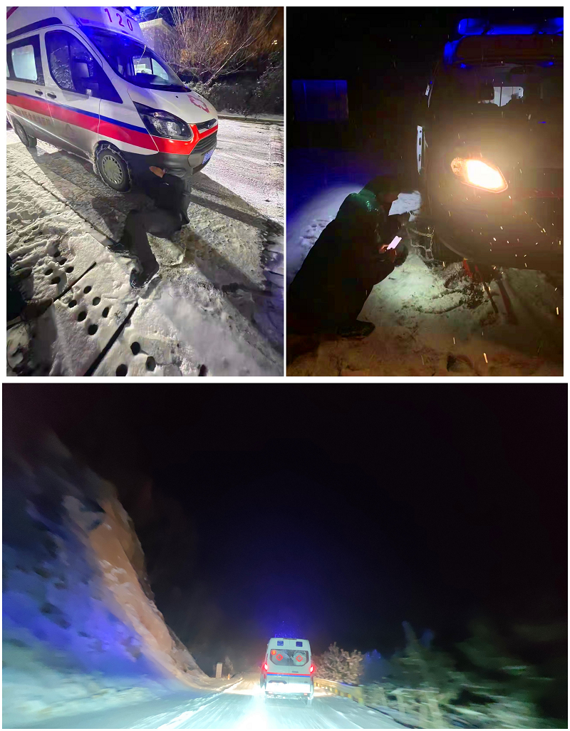 运送救护车穿梭在秦岭山深处,沿途路上已出现积雪结冰状况,凭借着多年驾驶经验,边师傅一边保持着车速,一边集中注意力观察前方路面情况,小心翼翼地在湿滑的盘山路上穿行,路面结冰严重,即使有防滑链,车辆依然时不时打滑抛锚。平日里只要90分钟的车程,这次运送却足足用了七个半小时,直到晚上8点多才返回金堆城医院,顺利完成了运送核酸检测样本的任务。