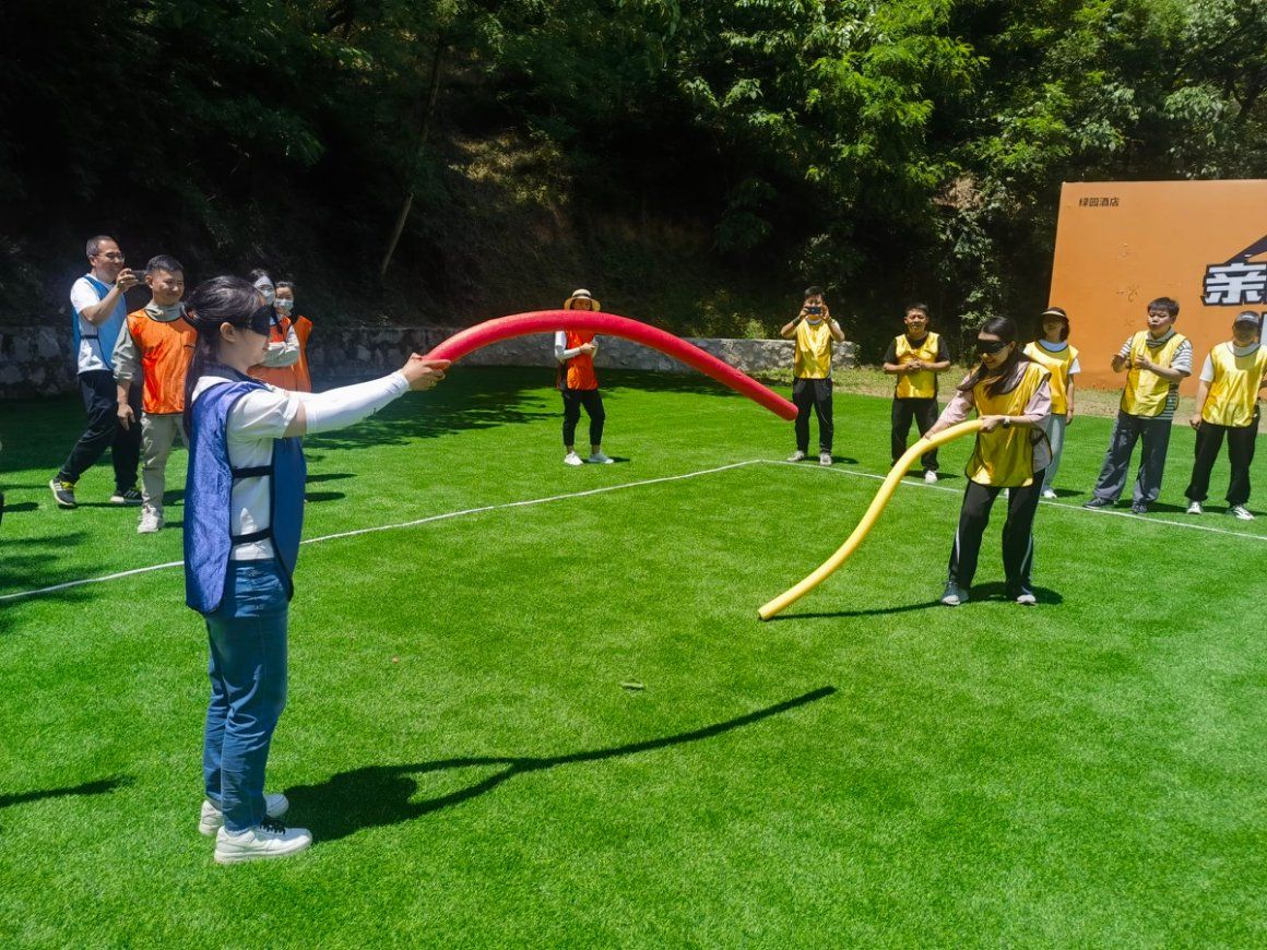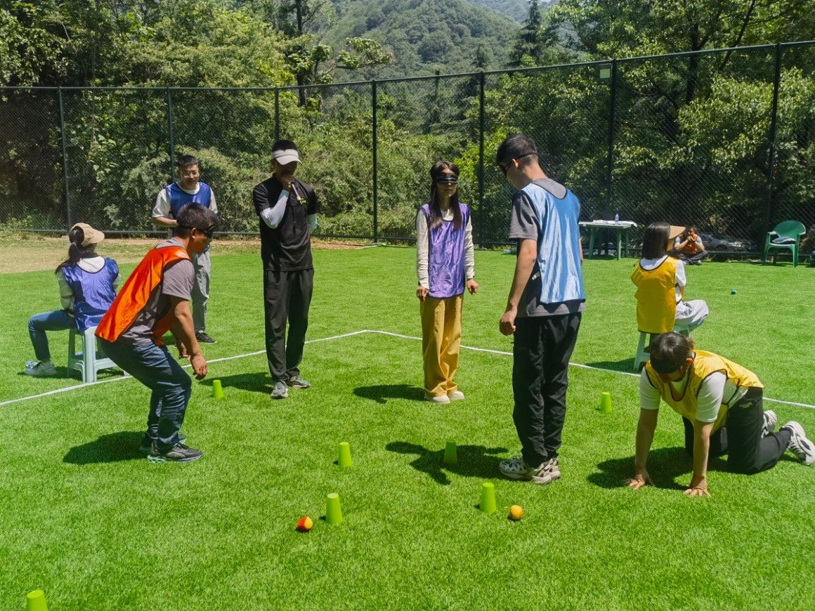 活动精心设计了多项团队协作项目。“鼓动人心”环节中,党员们通过默契配合调整鼓面角度,在反复尝试中领悟团队协作的关键;“摸石头过河”项目考验平衡与互助精神,队员们借助瑜伽砖有序渡河,展现出坚韧与智慧;“决战沙场”通过战术配合凸显沟通与信任的重要性;“蒙眼互打”则以轻松趣味的方式增进友谊,缓解工作压力。最后的拔河比赛将现场氛围推向高潮,队员们全力拼搏,彰显了团结奋进的精神风貌。