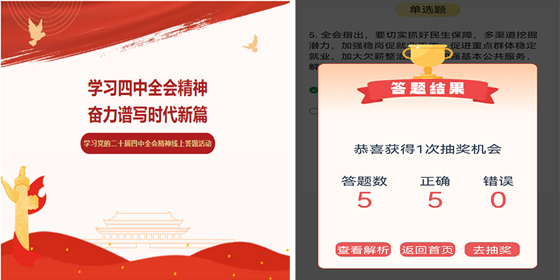 活动过程中,职工们学习热情高涨,不管是办公室职员,还是身处偏远野外作业点的技术人员,都充分利用工作间隙、休息时间,每日坚持登录答题平台学习党的二十届四中全会精神知识。大家不仅认真研读平台提供的学习资料,深入领会全会提出的新思想、新论断、新部署,还在答题过程中相互交流探讨,分享学习心得与答题技巧,形成了“比学赶超”的良好氛围。职工们的答题正确率始终保持较高水平,多数职工多次取得满分成绩,充分体现了二一一队职工过硬的政治素养与积极的学习风貌。