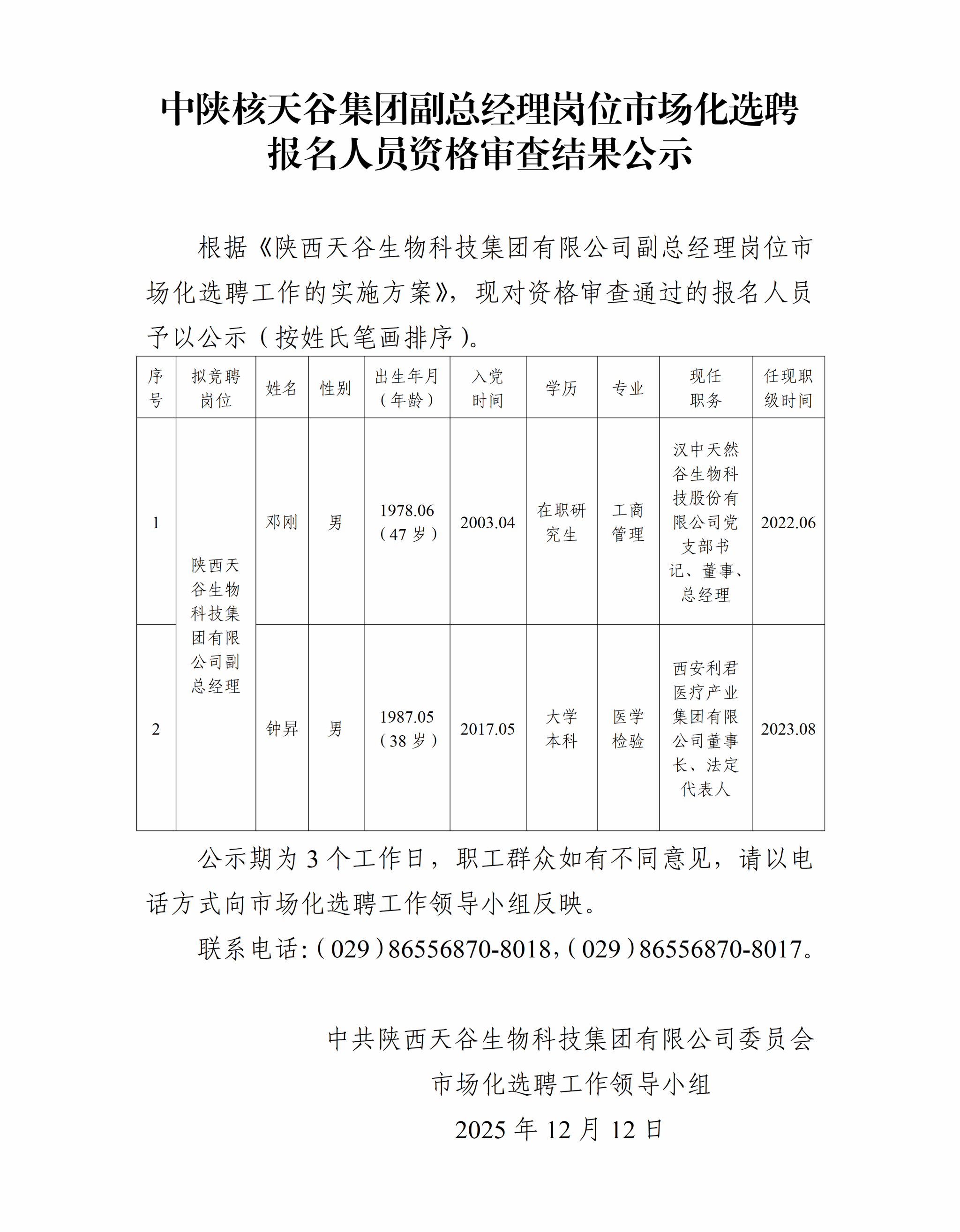 【中陕核】中陕核天谷集团副总经理岗位市场化选聘报名人员资格审查结果公示