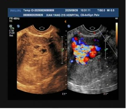 几天前,来自乾县的蒙女士被紧急送至陕西省核工业二一五医院妇科急诊。当时的她,面色苍白如纸,冷汗已浸湿衣衫,每一次呼吸都显得急促而费力。这一切,都源于蒙女士一个月前接受的药物流产加清宫手术,术后复查时发现宫腔内仍有组织残留。当地医院为她进行了为期10天的药物保守治疗。然而,就在停药后不久,她突然出现剧烈腹痛并伴有大量阴道出血,情况急转直下。B超提示宫腔内残留组织伴有异常丰富的血流信号,血HCG指标也高达490mIU/ml,情况危急,建议立即转入上级医院救治。