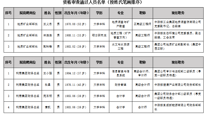 根据《中陕核工业集团有限公司关于部分中层管理岗位竞聘工作的实施方案》有关要求,现对资格审查通过的报名人员予以公示。