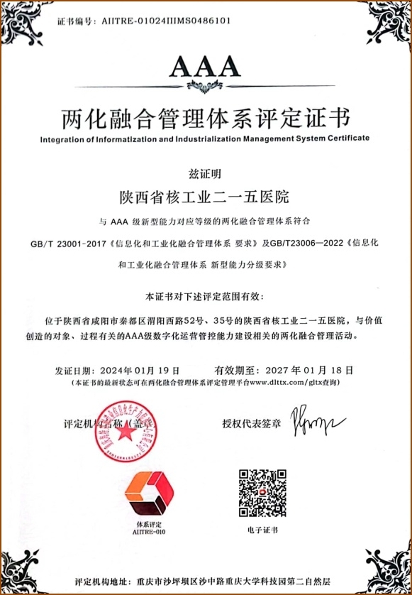 近日,陕西省核工业二一五医院顺利通过国家工业和信息化体系认证审核,荣获两化融合管理体系AAA级评定证书,这是我国两化融合管理体系目前开放的最高等级,作为国内首家通过高级别认证的医疗机构,这充分体现了二一五...