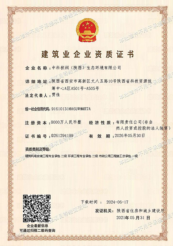 6月15日,经陕西省住建厅审批,中科核润(陕西)生态环境有限公司成功获批环保工程专业承包二级资质。这一资质的取得,标志着相关行业主管部门对中科核润的市场规模、项目管理等多方面的认可。 在当今“市场为王、项目为王”...