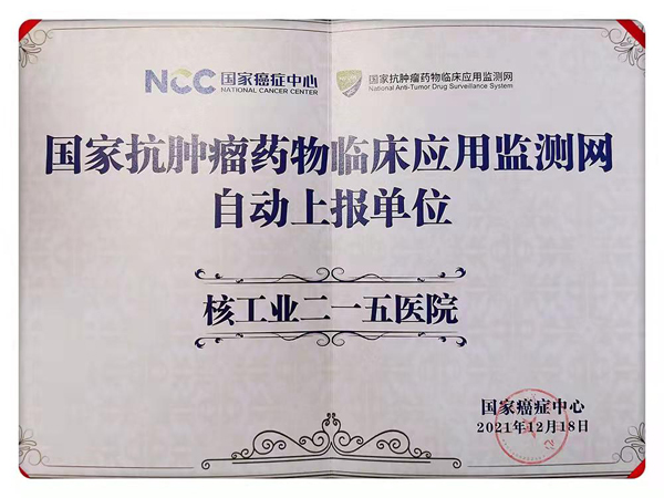 近日,陕西省核工业二一五医院被国家癌症中心、国家抗肿瘤药物临床应用监测网授予“2021年度全国抗肿瘤药物临床应用监测网优秀单位”。 自2019年,全国开展抗肿瘤药物临床应用监测工作以来,二一五医院积极按照国家...
