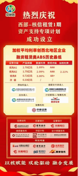 近日,由陕核投资所属子公司陕核租赁作为原始权益人的“西部-核信租赁1期资产支持专项计划”成功发行,总规模达5.5亿元,加权平均票面利率为2.11%。此次发行是陕核租赁继2024年首次亮相资本市场后的又一融资举措,加权平均票面利率创下西北地区融资租赁ABS历史新低。 自2018年成立以来,陕核租赁在中陕核集团和陕核投资的正确领导下,始终秉持产融结合的初心使命,坚持市场化运作与集团内部协同发展并重,紧扣租赁业务本源,积极拓展资本市场融资渠道,...