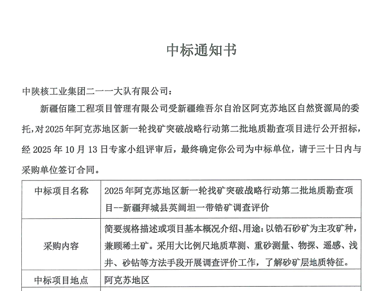 10月15日,从新疆政府采购网传来振奋人心的捷报,中陕核二一一队成功中标2025年阿克苏地区新一轮找矿突破战略行动第二批地质勘查项目——“新疆拜城县英阔坦一带锆矿调查评价”项目。对公司而言,锆矿调查评价是一个相对崭新的领域,此次中标为公司在拓展战略新兴资源地质勘查市场写下了浓墨重彩的一笔。项目启动初期,面临着资料收集有限、基础图件比例尺较小且多为不可编辑的图片资料、技术经验相对不足等多重挑战。时间紧、任务重,...